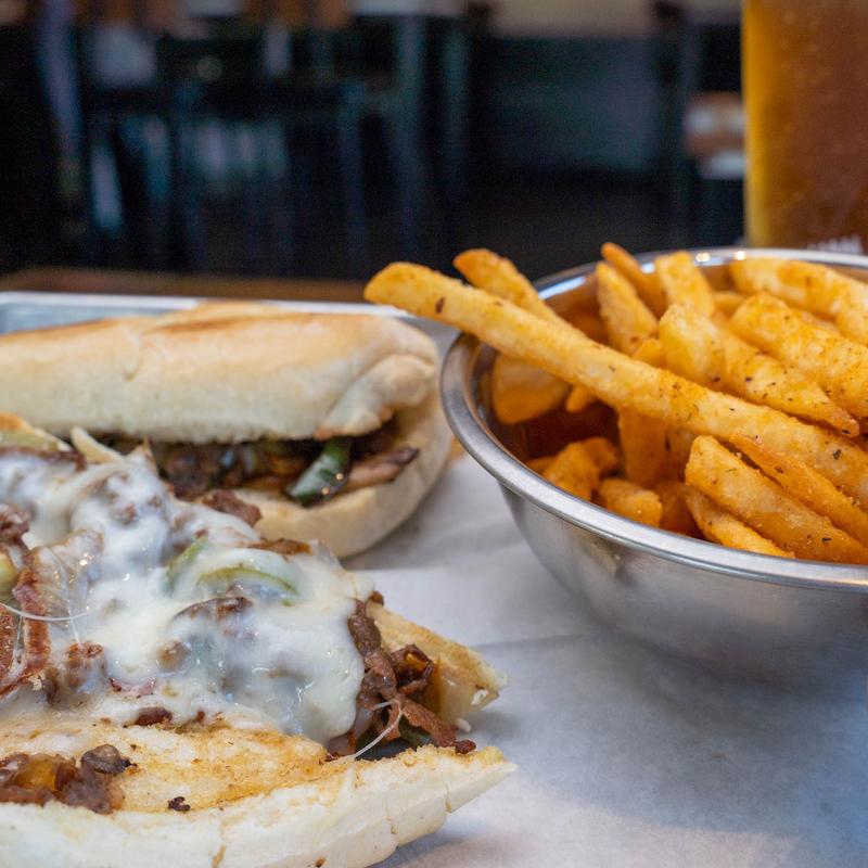 Thinly shaved steak on a premium Philly roll with slightly sautéed onions, peppers, and mushrooms, and then smothered in Rocas house cheese sauce.